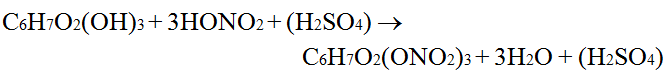 ويصنع النتروسيلولوز في معظمه حاليا من الياف الخشب اكثر مما يصنع من القطن للسيلولوز شكل جزيئي معقد ، وكثيرا ما يصل وزنه الجزيئي الى 300000 والعينة المفترضة منه ، أيا كانت ، تتضمن توزيعا واسعا للجزيئات ، وتحمل جميعها الصيغة العامة [C6H7O2(OH3)]n . وهكذا ، توجد ثلاث مجموعات هيدروكسيلية في الوحدة الاساسية (الغلوكوز ) يمكن استرتها بحمض الازوت لكي تعطي محتوى نظريا من النتروجين مقدار 14 % ، وهو اعلى من اي محتوى تجاري مستخدم . حسب التفاعل التالي :