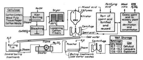 الصورة 1-1 . مخطط انتاجي لتصنيع نترات السيلولوز ( نتروسيلولوز ) . ملاحظة : يضبط ما تحتويه نترات السيلولوز من النتروجين بتركيب حمض النترجة الممزوج . تعتمد نوعية الناتج على نوعية السيلولوز المستخدم والعناية المكرسة لإجراءات التصنيع . والمراحل التي نراها هي للإنتاج العسكري . وفي الاستخدام ، يجفف الناتج الرطب عن طريق الازاحة بالكحول . لإنتاج 2.2 كغ من نترات السيلولوز الجافة ( 75.1 كغ من القطن الخام بحوالي 0.6 كغ من الالياف المنقاة ) ، نحتاج الى المواد والوسائل التالية : زغب القطن 75.0 كغ ، 1 % 100 HNO3 كغ ، (% 100) H2SO4 0.5 كغ ، Na2CO3 0.002 كغ ، كلور : كمية متغيرة لكنها قليلة ، ماء 227 ل ، عمل مباشر 0.03 ساعة عمل .