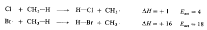 وكمثال، لنقارن تفاعلية ذرتي الكلور والبروم تجاه الميثان؛ أي لنقارن سرعتي التفاعلين في نفس الشروط: