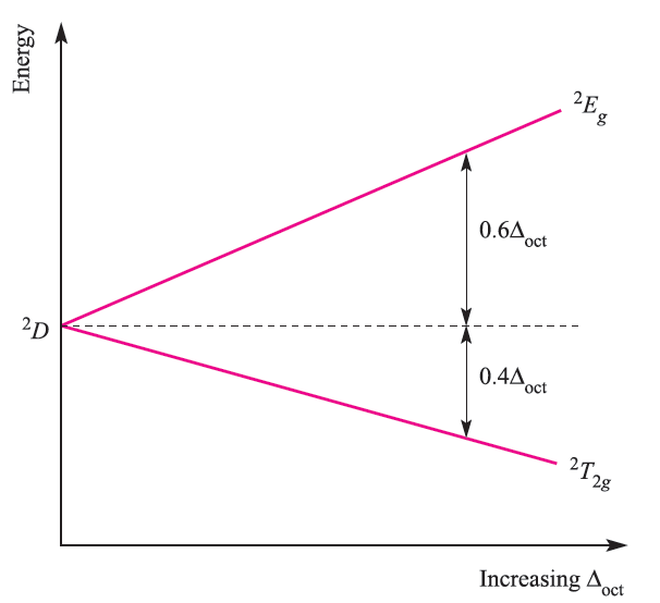 Electronic spectroscopy is a complicated topic and we shall restrict our discussion to high-spin complexes. The spectrum of [Ti)H2O(6]3+ (Figure 20.4) exhibits one broad band; close inspection shows the presence of a shoulder indicating that the absorption is actually two closely spaced bands arising from a Jahn–Teller effect in the excited state. The term symbol for the ground state of Ti3+ (d1, one electron for which ml = 2, L = 2, S = 1/2 ) is 2D. In an octahedral field, this is split into 2T2g and 2Eg terms separated by energy Δoct, the magnitude of which increases with increasing field strength (Figure 1.1).
