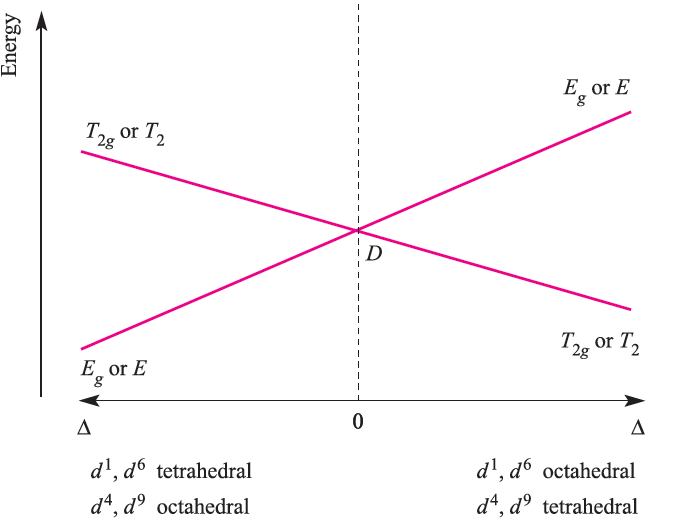 Figure 1.2 also shows that the diagram for a d1 or d9 ion is inverted by going from an octahedral to tetrahedral field. Because the Orgel diagram uses a single representation for octahedral and tetrahedral fields, it is not possible to indicate that Δtet = 4/9Δoct. Tetrahedral d4 and d6 ions can also be represented on the same Orgel diagram. Finally, Figure 1.2 shows that for each of the octahedral and tetrahedral d1, d4, d6 and d9 ions, only one electronic transition from a ground to excited state is possible: