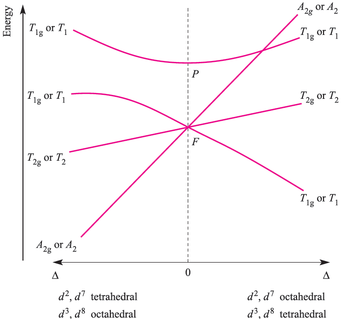 Fig. 1.3 Orgel diagram for d2, d3, d7 and d8 ions (highspin) in octahedral (for which T1g, T2g and A2g labels arerelevant) and tetrahedral (T1, T2 and A2 labels) fields. Multiplicities are not stated because they depend on the d n configuration, e.g. for the octahedral d2 ion, 3T1g, 3T2g and 3A2g labels are appropriate.