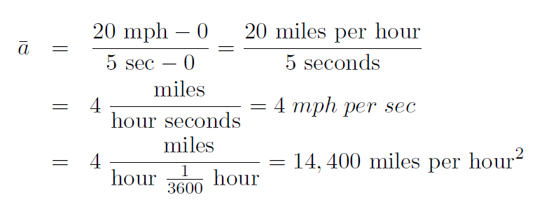 Example When driving your car, what is your average acceleration if you are able to reach 20 mph from rest in 5 seconds ?