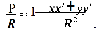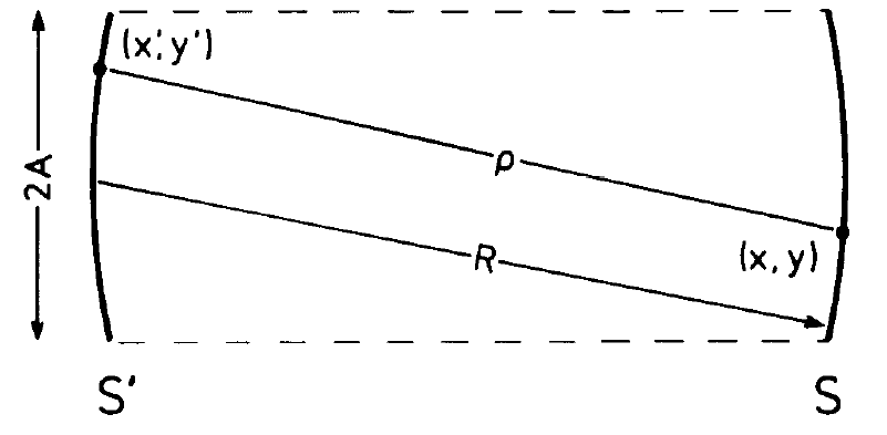 The total field at point x is found by integrating over all original points x' on a surface. In the following we shall consider the spherical mirrors as such a surface and we shall choose the coordinates x and y on them. Corresponding to the two mirrors S and S' we write