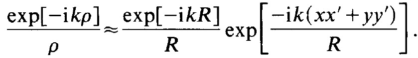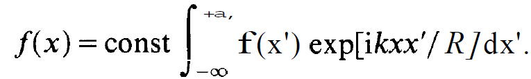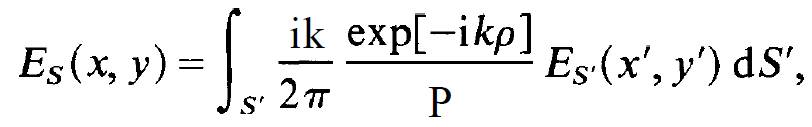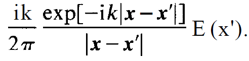 all the essential steps of the mathematical analysis can be seen when we deal with a scalar field using Huygens' principle. Let the field strength at point x' be given by E(x'). Then according to Huygens' principle this point is a starting point of a new spherical wave which produces a field strength at point x which is given by