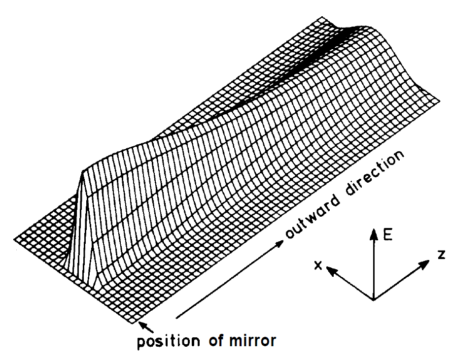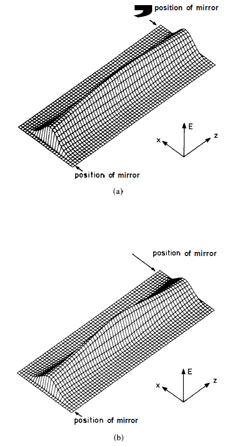 where sin(kz) describes the fast oscillations of the field, whereas f(z) is a slowly varying function. That means that in z-direction, i.e. in the direction of the laser axis, the field mode strongly resembles that of a mode in a closed cavity. The field outside the cavity can also be found by means of Huygens' principle and reads