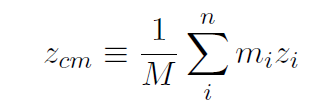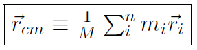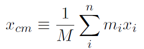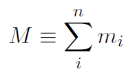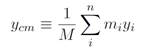 where the sum over i running from 1 to n means sum over all of the point particles within the body, assuming there are a total of n point particles. M is the total mass of all the individual bodies and can be written