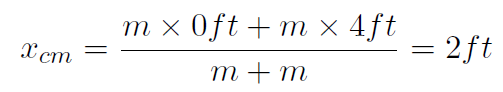 Solution Now you know that the answer to this must be at the center of the rod. After all that is the balancing point. That is our guess is that xcm = 2ft. Let's use our definition of center of mass, equation (1.1) and see if it gives this answer. Now we have a 1-dimensional problem and therefore (1.1) reduces to only (1.3). Furthermore we only have two bodies and this reduces further to (1.7). Choosing the origin of the x-coordinate system to be at the left dumbell gives x1 = 0ft and x2 = 4ft. Substituting gives