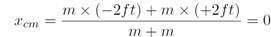 Solution Well now we would guess that the center of mass would be given by xcm = 0. Let's see if our formula works here. With the origin of the x-axis chosen to be at the center of the dumbells we have the position of each dumbell given by x1 = -2ft and x2 = +2ft respectively. Subsituting we get