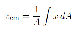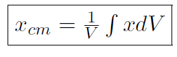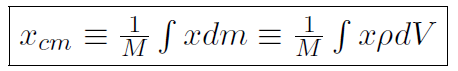 Above we considered finding the center of mass of two bodies. This can easily be extended to 3 or more bodies and some of this will be explored in the homework. That's all well and good, but how do we find the center of mass of systems made up of millions of particles such as a baseball bat. In other words how do we find the center of mass of rigid bodies ? That's what we will look at now. In physics whenever we want to change our study from a collection of discrete particles (desribed by a sum Σi) to a continuous collection of particles, the sum just changes to an integral. Hopefully this makes perfect sense from what you have studied in calculus. You all now know that an integral is just the limit of a sequence of sums. Now each of the millions of particles in a rigid body has a tiny little mass denoted by dm. For a discrete collection of particles we had (1.1) as