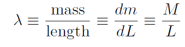 and the same for y and z. There's one additional catch. Above we defined a 3-dimensional density as mass / volume. But what if we have a dense 1-dimensional object such as a very long and thin pencil. Well then we will want a linear mass density. Instead of