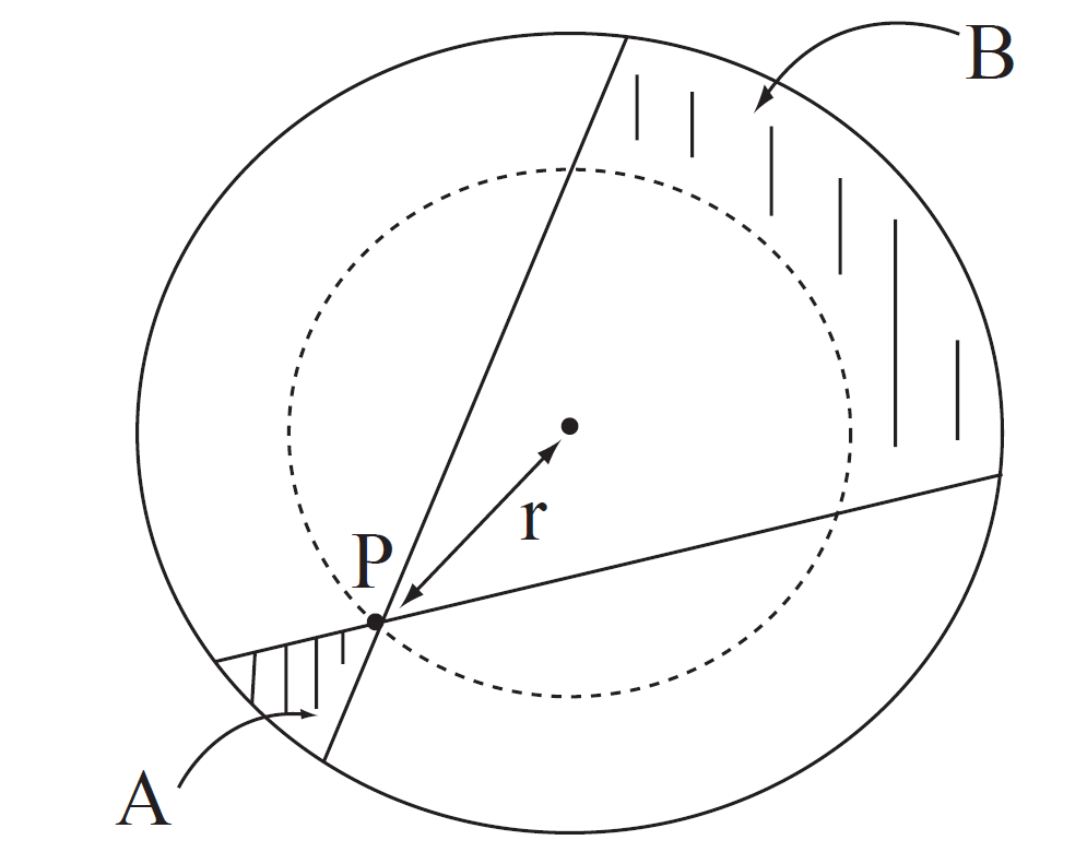 I have drawn a dotted circle of radius r intersecting point P. We all agree that the total mass located inside the dotted circle produces a net gravitational force on the person. However the mass outside the dotted circle produces no net gravitational force. This can be seen by considering the shaded regions A and B. Region A contains a small amount of mass which will pull the person at P outwards. However the mass contained in B will pull in the opposite direction. Now there is more mass in B, but it is further away and so the gravitational effects of the mass in A and in B cancel out. Thus we can ignore all of the mass located outside of the dotted circle.
