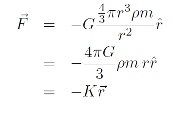 Example A hole is drilled from the United States to China through the center of Earth. Ignoring the rotation of Earth, show that a particle dropped into the hole experiences a gravitational force like Hooke's law, and therefore will undergo oscillation in the hole.