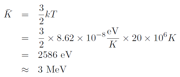 Example In the center of the Sun the particles are bare hydrogen nuclei (protons). Calculate their average kinetic energy.