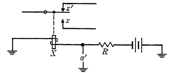 condition to be the state of switch a. No input path is shown, but an input path is involved if switch a is a contact on a relay Y, say, in which case the control path for the relay Y would be the input path for the circuit shown. Output paths may be formed by using either of the contacts operated by relay X. We would designate these contacts as x for the make and x' for the break contact.