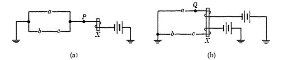 One more control path will be shown to illustrate some additional possibilities in a control circuit. First, suppose that a control path is to be designed in such a way that a relay X operates if switch a is closed or if both switches b and c are closed. A suitable control circuit is shown in Fig. 1-5(a). Suppose that it is desired to use switch a in another part of the circuit as well. If point P were to be connected to another circuit, the desired lead to ground would be formed if a were closed, but a lead to ground would also be formed if b and c were both closed. To avoid this difficulty, a doubly wound relay might be used to isolate a from be, as shown in Fig. 1-5(b): A lead from point Q may be used to include a in another part of the circuit.