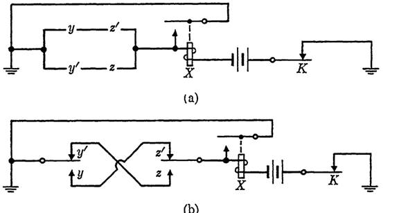 Solution. Referring to Fig. 1-3, a in the diagram must be replaced by a circuit which realizes the function f = yz' + y'z to satisfy the requirements for initial operation. Now a locking path is needed, as in Fig. 1-3, but if key K were inserted in place of b, the relay would not release at any time when f had the value 1. K will cause the release of the relay under any circumstances if it is introduced as indicated in Fig. 1-7(a). Figure 1-7(b) is equivalent to Fig. 1-7(a), but uses a different notation for the switches y and z.