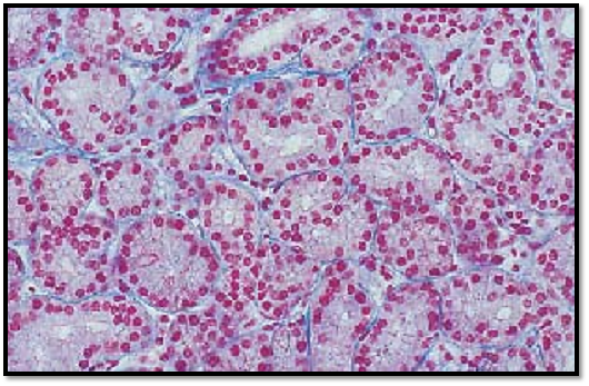 The tubules of the lacrimal gland of ten have wide lumina. They are therefore often referred to as tubuloalveolar glands .The irregularly shaped tubules can be clearly assessed at higher magnification. Note the shape of the gland cells (secretor y cells). The round nuclei are in basal position. The cytoplasm appears light, and cell borders can be clearly recognized in some places. Myoepithelial cells are found between the gland epithelium and the basal membrane. Note the delicate connective tissue between the tubules (here stained blue). The secretory product of the lacrimal glands (tears) moisturizes the cornea and the conjunctiva of the eyeball as well as the eyelids.