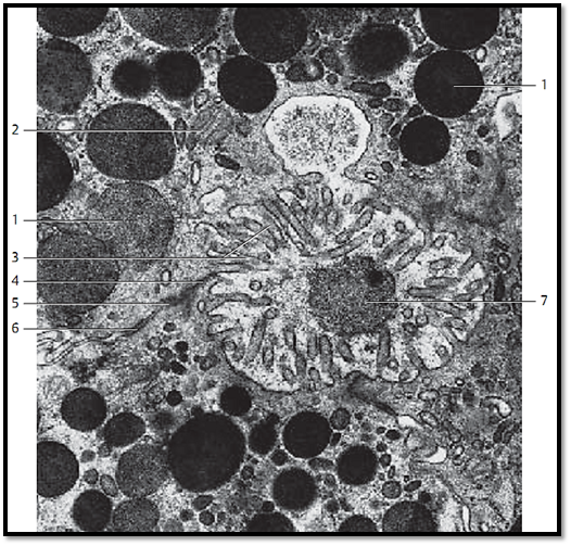 The varieties of secretory products of the exocrine and endocrine gland cells are store d in the cells as secretory granules or secretor y droplets. Intracellularly stored secretory granules may display a variety of appearances. The figure shows three acinar cells of the lacrimal gland. The secretory granules appear either homogeneous 1 or show low electron microscopic densities. They contain finely dispersed secretory particles. As shown in the figure, the secretory granules are released individually in response to stimuli. Microvilli 3 protrude into the acinar lumen. Note the granule in the lumen 7 . It has al-ready lost part of its membrane. The lateral surfaces of the secretory cells show apical junctional complexes (terminal bars) 456 .
