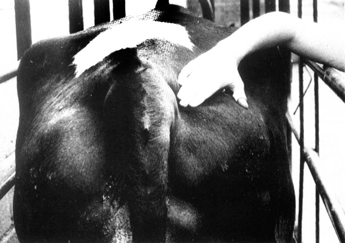 واذا تعسر ادراك تلك الحركات تجس البقرة من المستقيم باليد وذلك بان تدهن اليد الى المرفق بمادة كالزيت او الصابون لتسهيل ادخالها في المستقيم، فيجد الجاس الرحم تحت المستقيم مباشرة، والرحم في الاصل لا يزيد عن 9 سنتميترات، فان كان اكثر من ذلك وكان به انتفاخ دل ذلك على الحمل، وكلما تقدم زمن الحمل يتخلق الجنين فيدرك بسهولة.