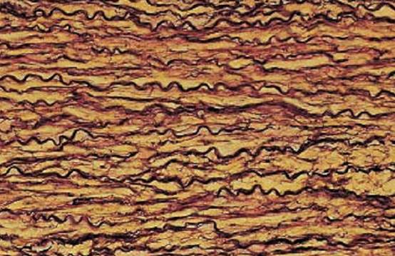 This figure shows a vertical section through the media of the thoracic aorta. The elastic fibers run in the wavy pattern of corrugated sheets. Between the black-violet elastic fibers are yellow-stained smooth muscle cells. In arteries of the elastic type, elastic structures can be seen as fibers only in vertical sections through the vessel wall. In fact, these structures are elastic membranes or lamellae. The regular staining methods, as used