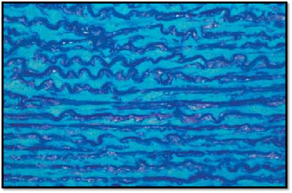 This section from an aorta wall shows elastic fibers, which dominate the picture in the form of undulating or stretched elements (stained deep blue). Smooth muscle cells (stained light blue) are present between elastic fibers. Only a vertical section of this artery close to the heart will display the elastin as more or less wavy fibers. However, parallel sections show that these are in fact elastic membranes. Elastic fibers withstand degradation using trypsin, heat (cooking) or hydrolysis with dilute acid or alkali. How-ever, elastase, a pancreatic enzyme, will hydrolyze elastin. Tunica me dia of the human thoracic aorta.