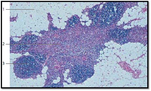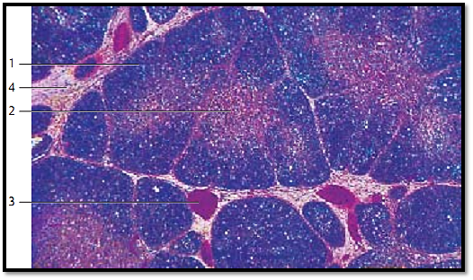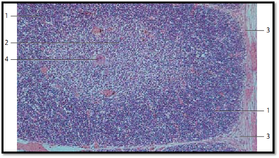 Higher magnification of a thymus lobule with heavily stained cortex 1 and lighter stained medulla 2 . Mature T-lymphocytes are densely packed in the cortex. They are much less dense in the medulla. On the right, the figure shows the vascularized connective tissue capsule 3. The medulla contains Hassall corpuscles 4.