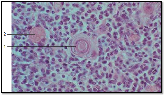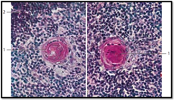 Large Hassall corpuscle 1 in the medullary thymus from a child. The figure shows the concentric layering of the reticulum cells particularly well. Note the somewhat larger epithelial reticulum cells in the medulla which interconnect via their cell processes and form a meshwork . There are fewer lymphocytes in that area. The sectioned blood vessels 2 are filled with erythrocytes. The thymus is equipped with a blood-thymus barrier , which is restricted to the cortex.