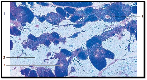 The thymus is derived from the pharyngeal pouch. In relationship with other lymphatic organs, it takes a central, superordinate place. In a histological cross-section, the infantile thymus is seemingly built of lobes. Each lobule consists of a corte x 1 (stained blue-violet), which is rich in lymphocytes, and the medulla (stained lighter and reddish) with lower cell density 2 . Vascularized connective tissue 3 , 4 fills the spaces between lobules. It also pushes into the organ, up to the border between cortex and medulla, forming septa (trabeculae). Meshwork s of reticulum cells (epithelial reticulum cells, lymphoepithelial organ ), not fibers, form the supportive structures for cortex and medulla. The reticular cells have arisen from entodermal epithelium. Small lymphocytes (T-lymphocytes) pre dominate underneath the cortex. The medulla contains mostly lymphoblasts, lymphocytes and epithelial reticulum cells. The thymus also contains mast cells, macrophages and interdigitating dendritic cells. The literature of ten describes six different types of epithelial cells. Lymph follicles with germinal centers do not exist in the thymus.