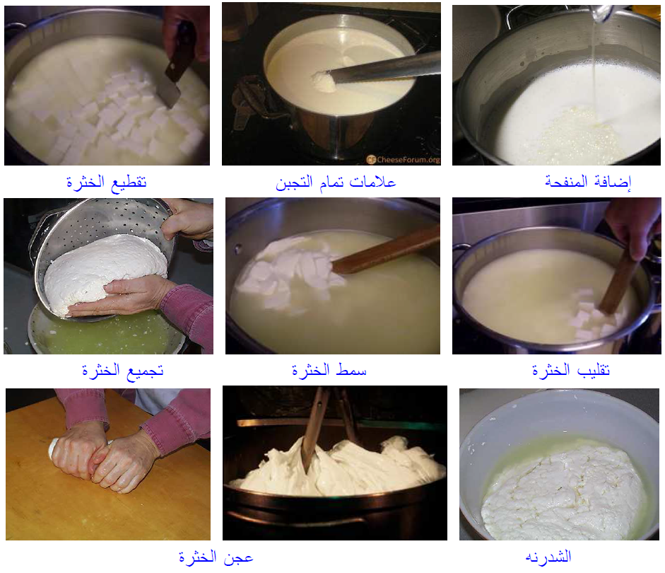٥. تقلب قطع الخثرة تدريجيا وبحرص حتى تنكمش ويتغير شكل القطع الخثرية من مكعبات إلى حبات البسلة وعندئذ ترفع درجة حرارتها بواسطة الماء الساخن بين جداري الحوض ونستمر في رفع الحرارة مع التقليب في مدة قدرها ١٥ دقيقه حتى تصل الحرارة إلى ٣٧ م وحموضة الشرش تبلغ 0.16% بعدها تترك الخثرة لمدة ٢٥ دقيقه لترسب في قاع الحوض.