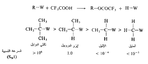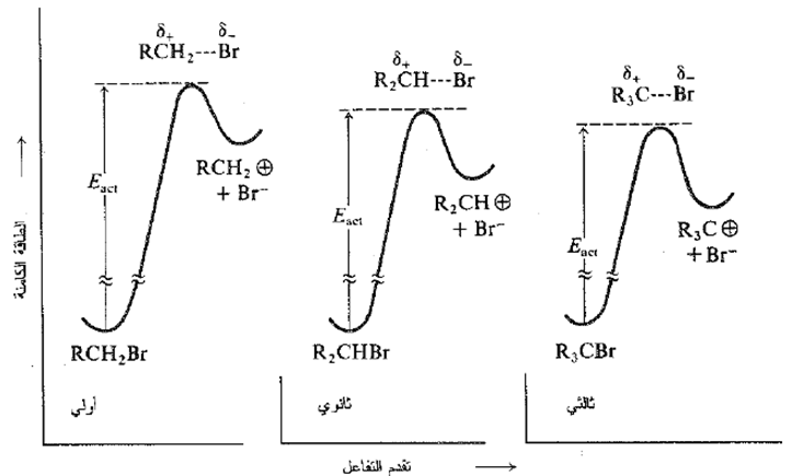 وهكذا نملك زمرة الألكيل إلى المدى الذي تكون فيه الرابطة C-X قد كسرت، سمة الكربوكاتيون الذي ستكونه فالعامل ذاته أي المنح الالكتروني الذي يثبت الكربوكاتيون، يثبت كذلك بداية الكربوكاتيون في الحالة الانتقالية.