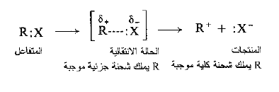 أما في الحالة الانتقالية فيجب أن تكون الرابطة C – X مكسورة جزئياً، ويكون الهالوجين قد سحب الشفع الالكتروني، جزئياً، بعيداً عن الكربون . ويكون الهالوجين قد اكتسب الشحنة السالبة جزئياً، والتي سيحملها ايون الهاليد. والأكثر اهمية هو كون الكربون قد اكتسب جزئياً الشحنة الموجبة التي سيحملها الكربوكاتيون.
