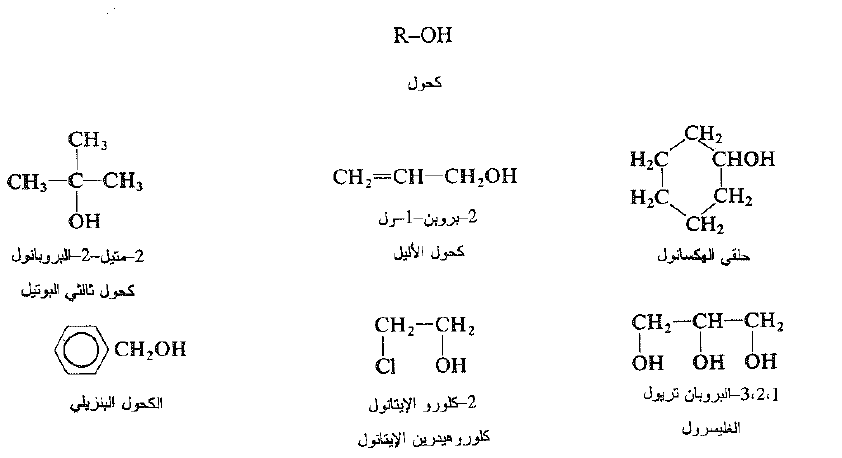 الكحولات مركبات لها الصيغة العامة ROH، حيث R أي زمرة الكيلية أو الكيلية ممستبدلة . وقد تكون الزمرة أولية او ثانوية أو ثالثية، وقد تكون الكحولات مفتوحة السلسلة أو حلقة؛ وقد تحتوي على ذرة هالوجين او هيدروكسيلات إضافية أو واحدة من عدة زمر غير شائعة بالنسبة لنا؛ على سبيل المثال رابطة ثنائية او حلقة عطرية. نذكر على سبيل المثال:
