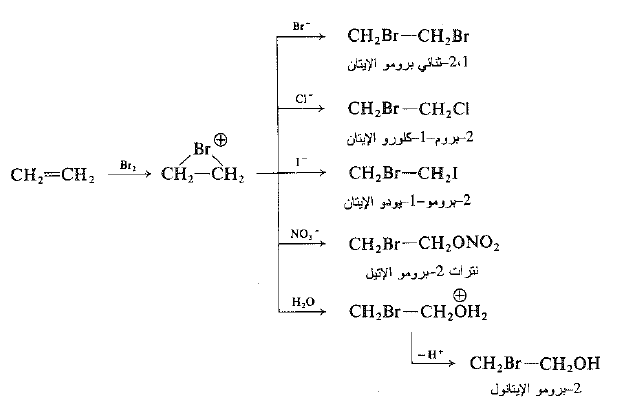 على التفاعل مع أيون الهاليد، عندئذ نتوقع ان بتفاعل مع معظم الايونات السالبة أو الجزيئات القاعدةية التي ترغب بتوافرها . فمثلاً، يجب ان يكون ايون البرومونيوم المتشكل من التفاعل بين الإيتيلين والبروم، قادراً على التفاعل ليس فقط مع أيون البروميد، ولكن ايضاً – إذا كان موجوداً – مع أيون الفلوريد او أيون اليوديد أو أيون النترات، أو مع الماء.