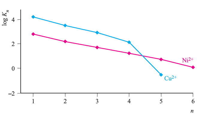 The magnitude of the overall stability constant for complexation of Cu2+ is dominated by values of Kn for the first four steps and the thermodynamic favourability of these displacement steps is responsible for the position of Cu2+ in the Irving–Williams series.