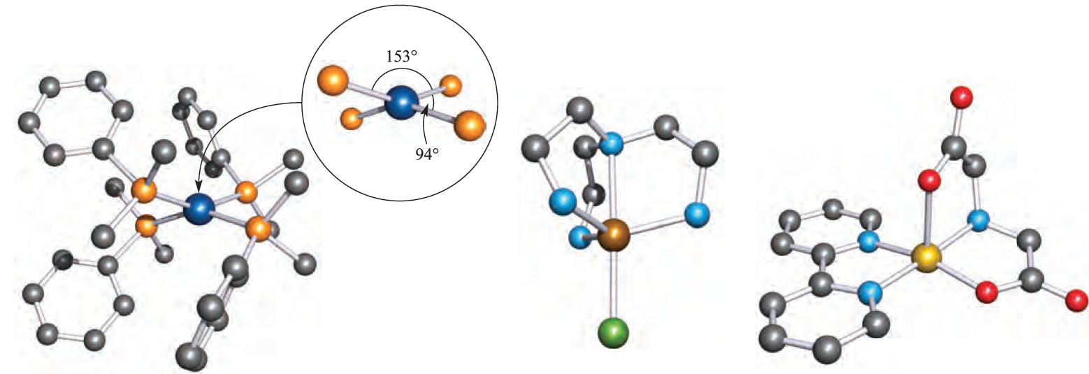 Fig. 1.1 Examples of 4- and 5-coordinate structures (X-ray diffraction data): (a) in [Rh(PMe2Ph)4]+, the steric demands of the ligands distort the structure from the square planar structure expected for this d 8 metal centre [J.H. Reibenspies et al. (1993) Acta Crystallogr., Sect. C, vol. 49, p. 141], (b) [Zn{N(CH2CH2NH2)3}Cl]+ in the [Ph4B]- salt [R.J. Sime et al. (1971) Inorg. Chem., vol. 10, p. 537], and (c) [Cu(bpy){NH(CH2CO2(2}], crystallized as the hexahydrate [R.E. Marsh et al. (1995) Acta Crystallogr., Sect. B, vol. 51, p. 300]. Hydrogen atoms are omitted for clarity; colour code: Rh, dark blue; P, orange; Zn, brown; Cl, green; N, light blue; Cu, yellow; O, red; C, grey.
