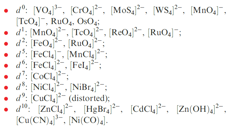 4-Coordinate complexes are extremely common, with a tetrahedral arrangement of donor atoms being the most frequently observed. The tetrahedron is sometimes ‘flattened’, distortions being attributed to steric or crystal packing effects or, in some cases, electronic effects. Tetrahedral complexes for d3 ions are not yet known, and for d4 ions have only been stabilized with bulky amido ligands, e.g. [M(NPh2)4] and [M{N(SiMe3)2}3Cl] for M = Hf or Zr. Simple tetrahedral species include: