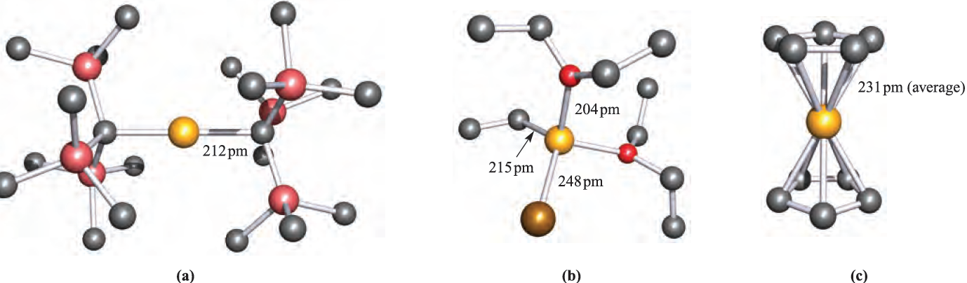 Fig. 1.1 The solid state structures, determined by X-ray diffraction, of (a) Mg{C(SiMe3)3}2 [S.S. Al-Juaid et al. (1994) J. Organomet. Chem., vol. 480, p. 199], (b) EtMgBr.2Et2O [L.J. Guggenberger et al. (1968) J. Am. Chem. Soc., vol. 90, p. 5375], and (c) Cp2Mg in which each ring is in an η5-mode and the two rings are mutually staggered [W. Bunder et al. (1975) J. Organomet. Chem., vol. 92, p. 1]. Hydrogen atoms have been omitted for clarity; colour code: Mg, yellow; C, grey; Si, pink; Br, brown; O, red.