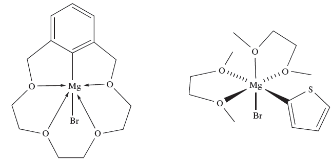A few examples of 5- and 6-coordination have been observed, e.g. in 1.1 where the macrocyclic ligand imposes the higher coordination number on the metal centre. The preference for an octahedral structure can be controlled by careful choice of the R group, e.g. R = thienyl as in complex 1.2. The introduction of two or more didentate ligands into the octahedral coordination sphere leads to the possibility of stereoisomerism, e.g. 1.2 is chiral. Enantiomerically pure Grignard reagents have potential for use in stereoselective organic synthesis. Solutions of Grignard reagents may contain several species, e.g. RMgX, R2Mg, MgX2, RMg(µ-X)2MgR, which are further complicated by solvation. The positions of equilibria between these species are markedly dependent on concentration, temperature and solvent; strongly donating solvents favour monomeric species in which they coordinate to the metal centre.