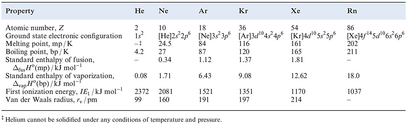 Some physical properties of the group 18 elements are listed in Table 1.1.