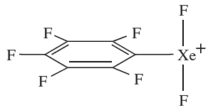 leaving seven valence electrons. Each F atom provides one electron to the valence shell of Xe. The C6F5 group is bonded through carbon to Xe and provides one electron to the valence shell of Xe.