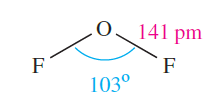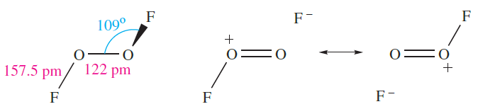 The molecular shape of O2F2 (1.2) resembles that of H2O2 (Figure 15.9) although the internal dihedral angle is smaller (878). The very long O_F bond probably accounts for the ease of dissociation into O2F* and F*. Structures 1.3 show valence bond representations which reflect the long O_F and short O_O bonds; compare the O_O bond distance with those for O2 and derived ions (Section 15.4) and H2O2 (Table 15.3).
