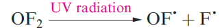 Pure OF2 can be heated to 470Kwithout decomposition, but it reacts with many elements (to form fluorides and oxides) at, or slightly above, room temperature. When subjected to UV radiation in an argon matrix at 4 K, the OF- radical is formed (equation 1.3) and on warming, the radicals combine to give dioxygen difluoride, O2F2.