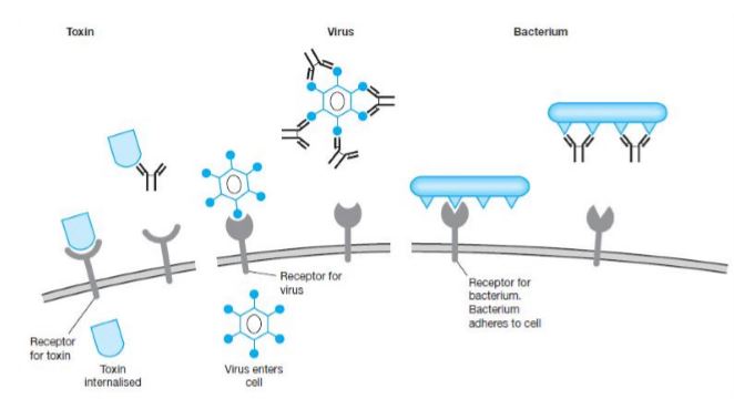 - معادلة البكتيريا : تمنع الأجسام المضادة التصاق البكتيريا بالخلايا ، كما تمنع عمليات الأيض لديها metabolism بالارتباط بثقوب صغيرة في الجدار الخلوي للبكتيريا تستخدمها لإدخال العناصر المغذية .