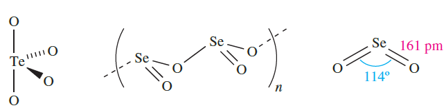 Selenium and tellurium dioxides are white solids obtained by direct combination of the elements. The polymorph of TeO2 so formed is α-TeO2, whereas β-TeO2 occurs naturally as the mineral tellurite. Both forms of TeO2 contain structural units 1.1 which are connected by shared O atoms into a three-dimensional lattice in α-TeO2, and into a sheet structure in the β-form. The structure of SeO2 consists of chains (1.2) in which the Se centres are in trigonal pyramidal environments. Whereas SeO2 sublimes at 588 K, TeO2 is an involatile solid (mp 1006 K). In the gas phase, SeO2 is monomeric with structure 1.3. The trends in structures of the dioxides of S, Se and Te and their associated properties (e.g. mp, volatility) reflect the increase in metallic character on descending group 16.