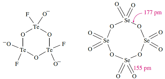 Selenium dioxide is very toxic and is readily soluble in water to give selenous acid, H2SeO3. It is readily reduced, e.g. by hydrazine, and is used as an oxidizing agent in organic reactions. The α-form of TeO2 is sparingly soluble in water, giving H2TeO3, but is soluble in aqueous HCl and alkali. Like SeO2, TeO2 is a good oxidizing agent. Like SO2, SeO2 and TeO2 react with KF (see equation 15.85). In solid K[SeO2F], weak fluoride bridges link the [SeO2F]- ions into chains. In contrast, the tellurium analogue contains trimeric anions (structure 1.4, see worked example below). Selenium trioxide is a white, hygroscopic solid. It is difficult to prepare, being thermodynamically unstable with respect to SeO2 and O2 (ΔfHo(298 K): SeO2 = _225; SeO3 = _184 kJ mol-1). It may be made by reaction of SO3 with K2SeO4 (a salt of selenic acid). Selenium trioxide decomposes at 438 K, is soluble in water, and is a stronger oxidizing agent than SO3. In the solid state, tetramers (1.5) are present.