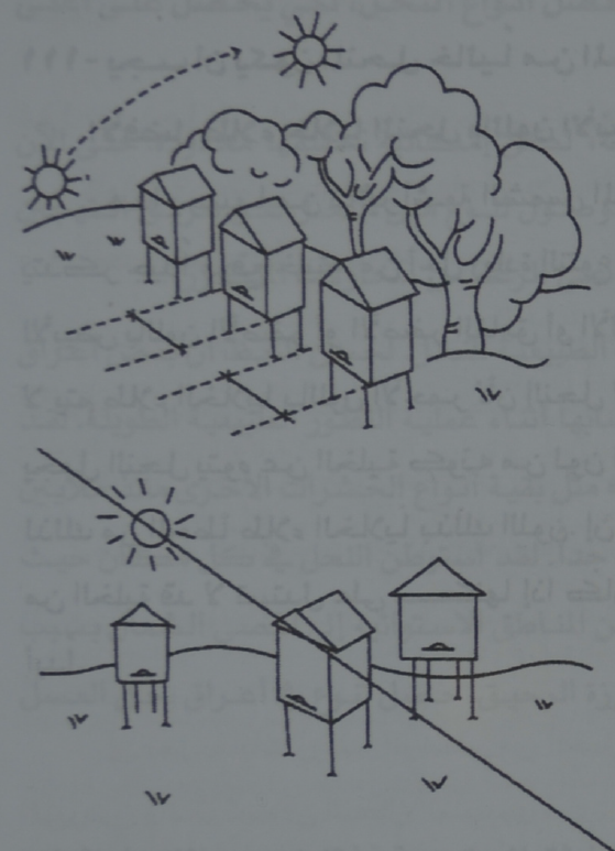 5– من الأفضل وضع خلايا النحل بحيث تسقط عليها شمس الصباح أول شروقها. ان ضوء الشمس يوقظ النحل صباحاً ويحرضه على بدء الجني باكراً. في المقابل عليك حماية الخلايا من تعرضها لأشعة الشمس المباشرة في فترة القيظ, وفي منتصف النهار بحيث تقع تحت ظل الأشجار في مثل هذا الوقت.