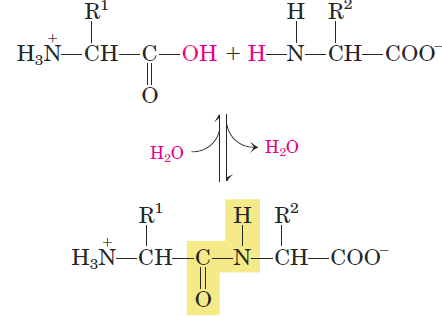 FIGURE 1.1 Formation of a peptide bond by condensation. The α-amino group of one amino acid (with R1 --> group) acts as a nucleophile to displace the hydroxyl group of another amino acid (with R2--> group), forming a peptide bond (shaded in yellow). Amino groups are good nucleophiles, but the hydroxyl group is a poor leaving group and is not readily displaced. At physiological pH, the reaction shown does not occur to any appreciable extent.