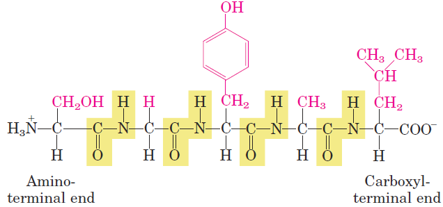 FIGURE 1.2 The pentapeptide serylglycyltyrosylalanylleucine, or Ser–Gly–Tyr–Ala–Leu. Peptides are named beginning with the aminoterminal residue, which by convention is placed at the left. The peptide bonds are shaded in yellow; the R groups are in red.