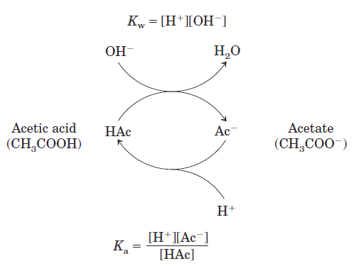 FIGURE 1.1 The acetic acid–acetate pair as a buffer system. The system is capable of absorbing either H+ or OHˉ through the reversibility of the dissociation of acetic acid. The proton donor, acetic acid (HAc), contains a reserve of bound H+, which can be released to neutralize an addition of OHˉ to the system, forming H2O. This happens because the product [H+][OHˉ] transiently exceeds Kw (1×10ˉ14 M2). The equilibrium quickly adjusts so that this product equals 1 × 10ˉ14 M2 (at 25 oC), thus transiently reducing the concentration of H+. But now the quotient [H+][Acˉ] / [HAc] is less than Ka, so HAc dissociates further to restore equilibrium. Similarly, the conjugate base, Acˉ, can react with H+ ions added to the system; again, the two ionization reactions simultaneously come to equilibrium. Thus a conjugate acid-base pair, such as acetic acid and acetate ion, tends to resist a change in pH when small amounts of acid or base are added. Buffering action is simply the consequence of two reversible reactions taking place simultaneously and reaching their points of equilibrium as governed by their equilibrium constants, KW and Ka.